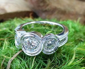 Center stone is 0.71ct. Round breliant cut and two side stones are o.43ct. and 0.31ct, bezel set in twisted pattern made in 14k white gold.