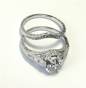 This beautiful Art-Deco mounting is crafted for an inherited grandma’s 1.24 carat old European cut diamond. Forty four round brilliant cut diamond along with six baguettes on the shoulder for total diamond weight of 0.69 carat has been masterfully set in the engagement ring. Master hand engraver has decorated the 14k white gold engagement ring and the matching band.